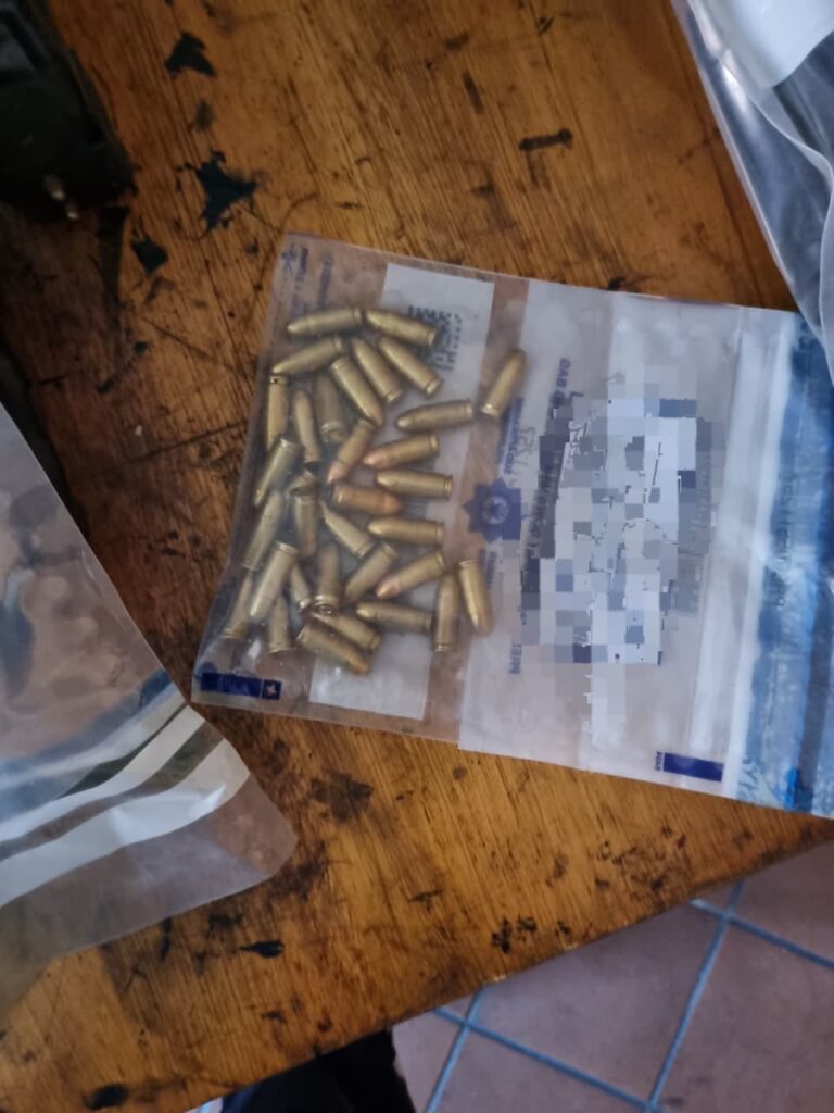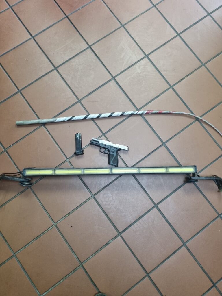 1 × 9mm pistol with 2 magazines and 33 live rounds of ammunition,1 × sjambok, 1 × white strobe light, 1 × notebook linked to alleged extortion. The motor vehicle was also confiscated.